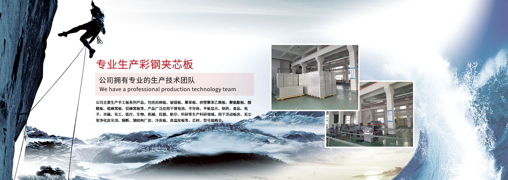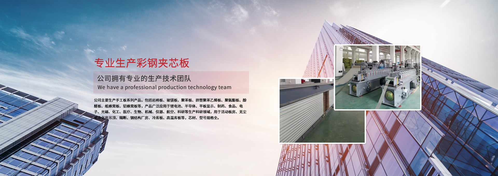 公司主要生產手工板系列產品,包括巖棉板、玻鎂板、聚苯板、擠塑聚苯乙烯板、聚氨酯板、酚醛板、紙蜂窩板、鋁蜂窩板等,產品廣泛應用于鋰電池、半導體、平板顯示、制藥、食品、電子、光磁、化工、醫療、生物、機械、儀器、航空、科研等生產科研領域,用于活動板房、無塵室凈化房吊頂、隔斷、鋼結構廠房、冷庫板、高溫庫板等,芯材、型號規格全。 公司擁有專業的生產技術團隊,周到的服務保證,以“質量至上、信譽至上、服務至上”為宗旨,為用戶提供合格的產品和滿意的服務,歡迎各界朋友參觀、指導!公司竭誠希望與各界朋友建立廣泛聯系,加強相互合作、共同發展!